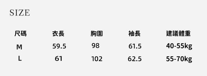 2. 建議體重會因每人感受、身材比例及穿著習慣而有所不同,僅供參考。