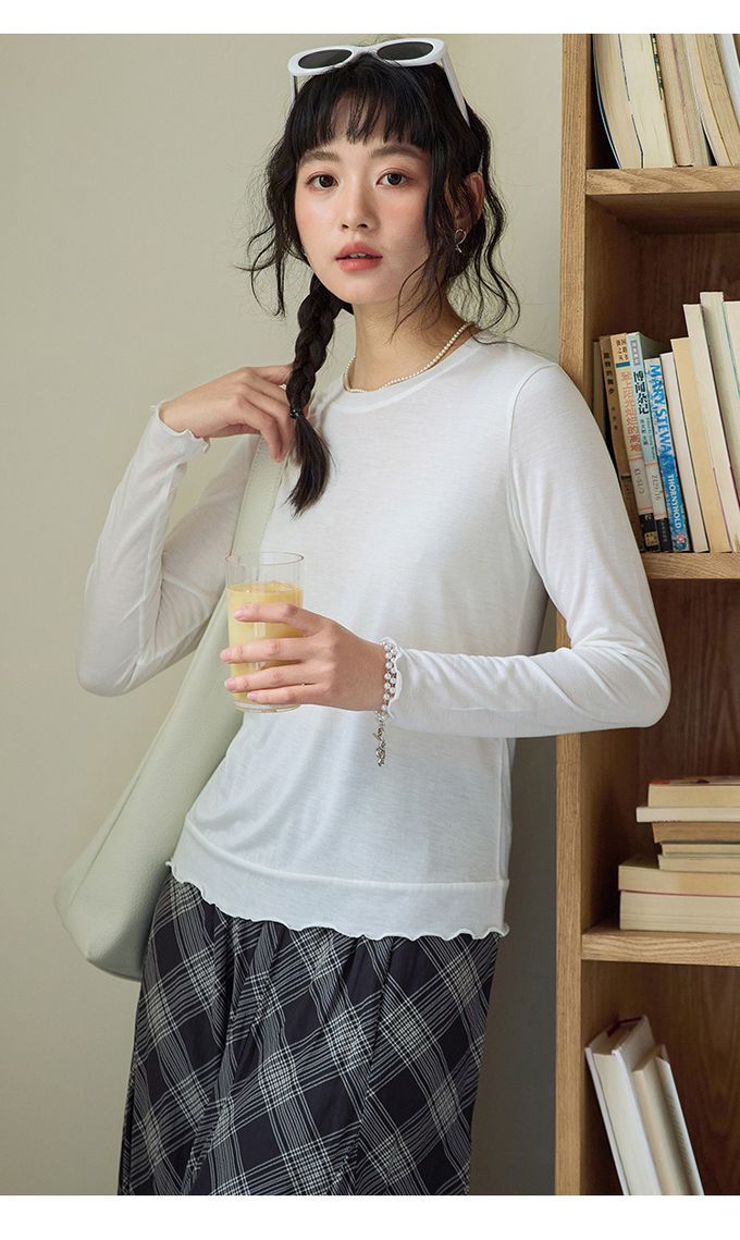 KPUWARM - 細緻綿柔3.2%羊毛天絲木耳邊長袖上衣-椰奶白