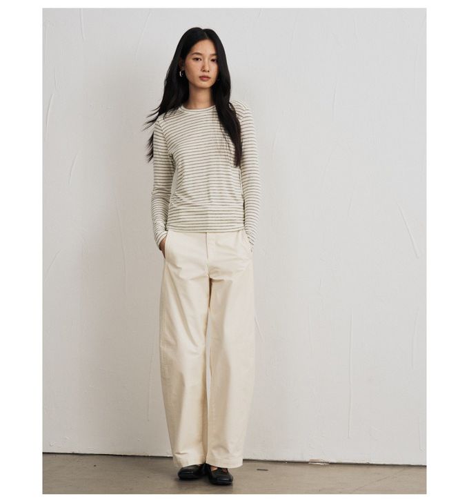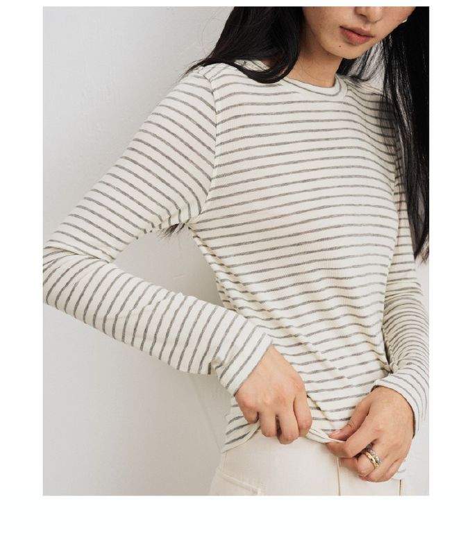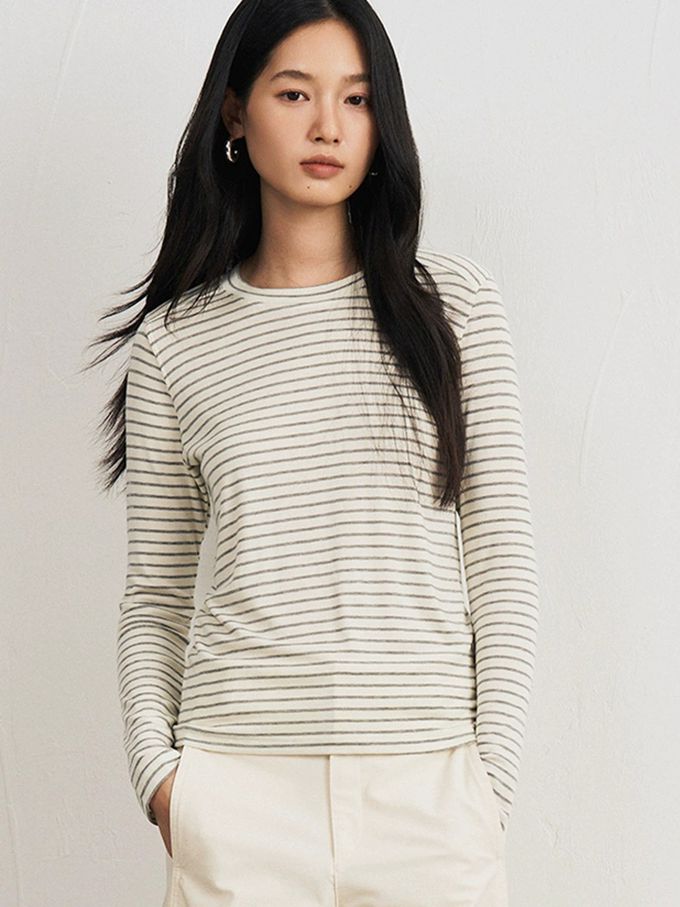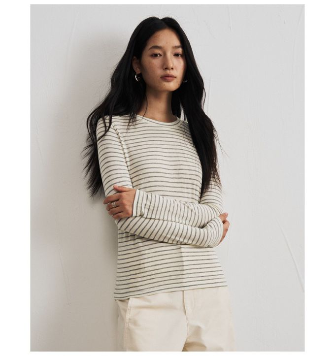 KPUWARM - 輕柔暖感4.4%羊毛天絲親膚圓領長袖上衣-雲灰條紋