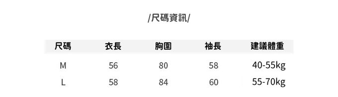2. 建議體重會因每人感受、身材比例及穿著習慣而有所不同,僅供參考。