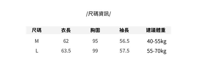 2. 建議體重會因每人感受、身材比例及穿著習慣而有所不同,僅供參考。