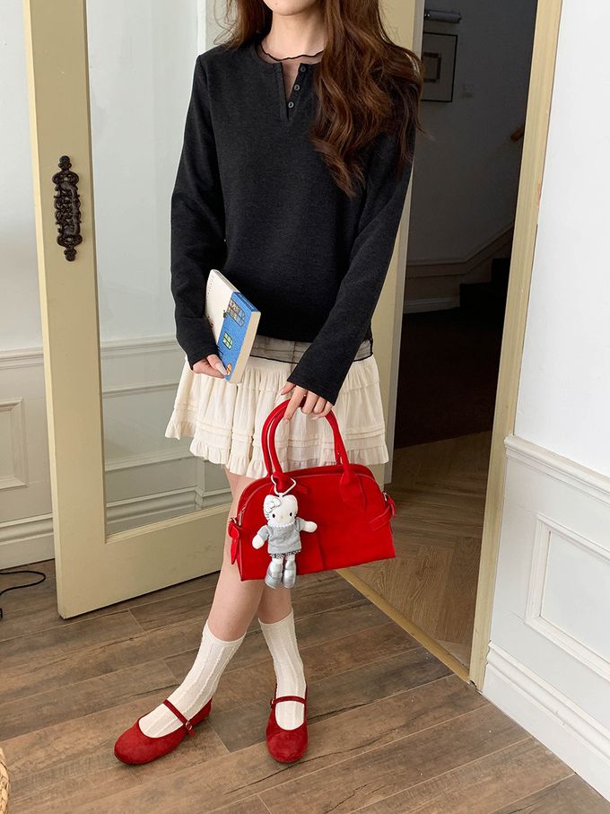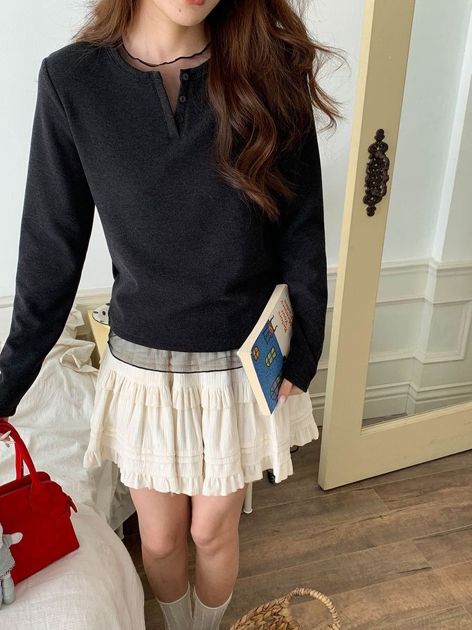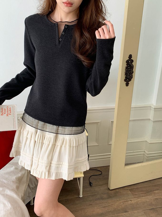 3th Morning - 溫柔系V領鈕扣網紗拼接長袖上衣-深灰 (F)