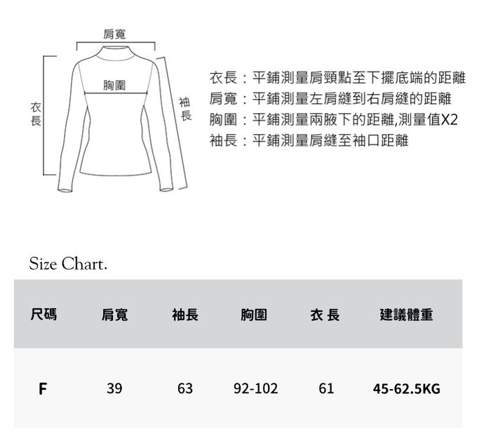 1. 尺寸表單位皆為公分(cm),商品皆為平鋪測量,實際尺寸會因布料彈性、水洗、測量起迄點等因素略有誤差,敬請諒解。