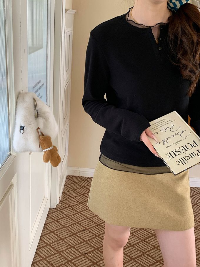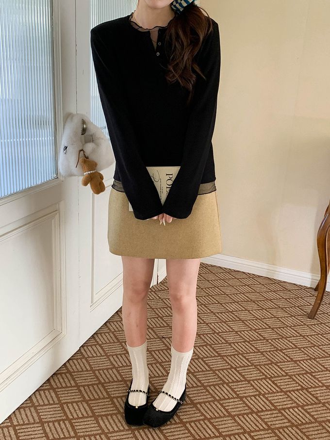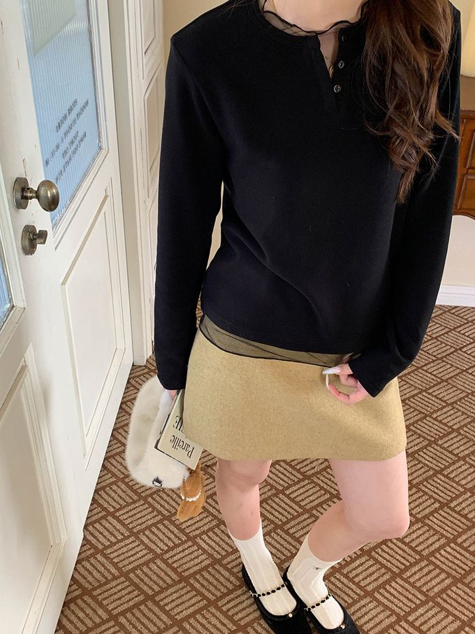 3th Morning - 溫柔系V領鈕扣網紗拼接長袖上衣-黑 (F)