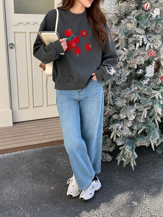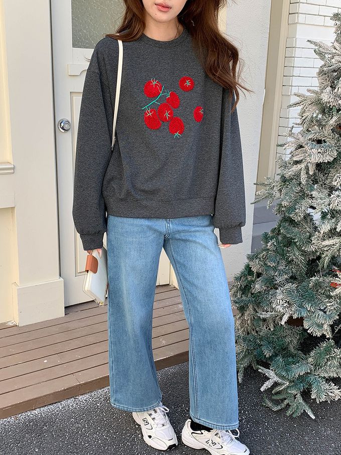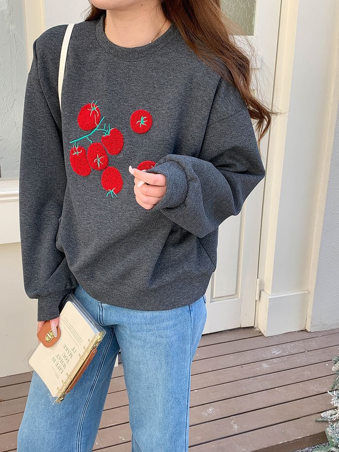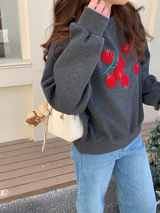 3th Morning - 毛巾繡小蕃茄點綴長袖大學T-深灰 (F)