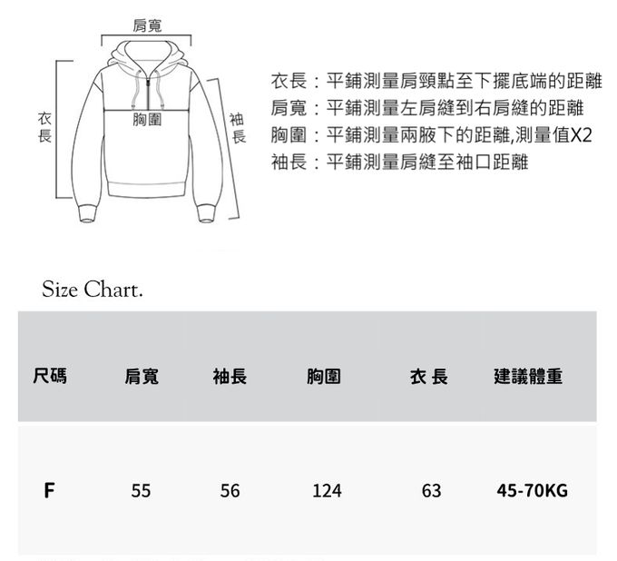 1. 尺寸表單位皆為公分(cm),商品皆為平鋪測量,實際尺寸會因布料彈性、水洗、測量起迄點等因素略有誤差,敬請諒解。
