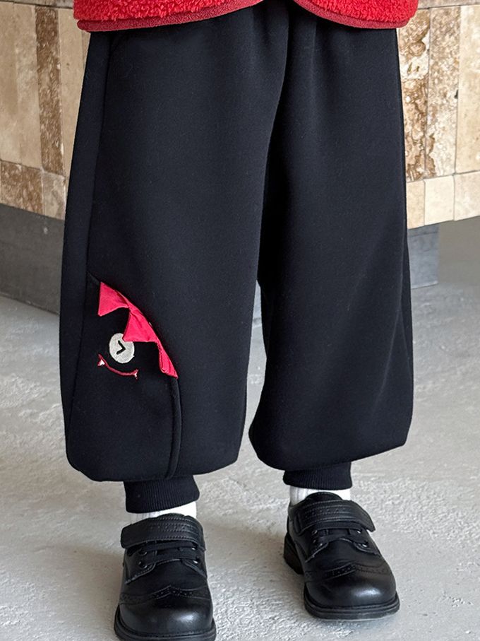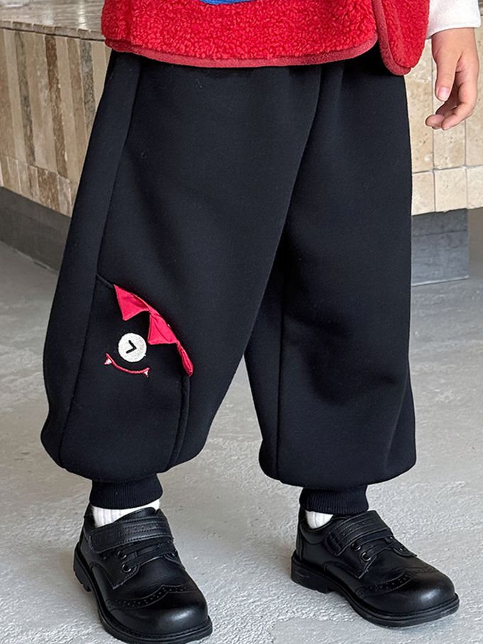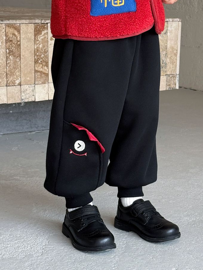 加絨款運動休閒長褲-立體小怪獸-黑色
