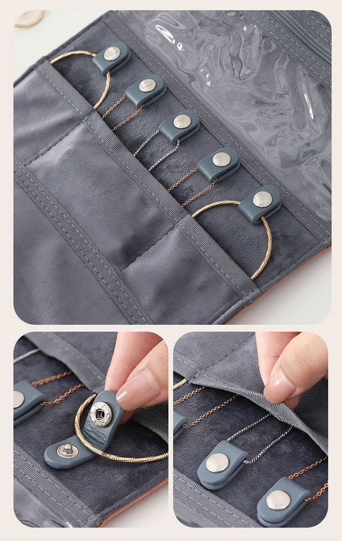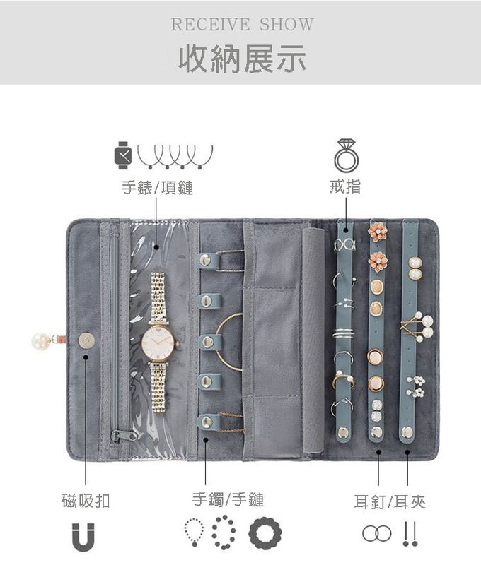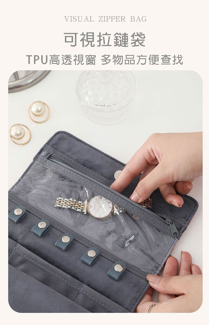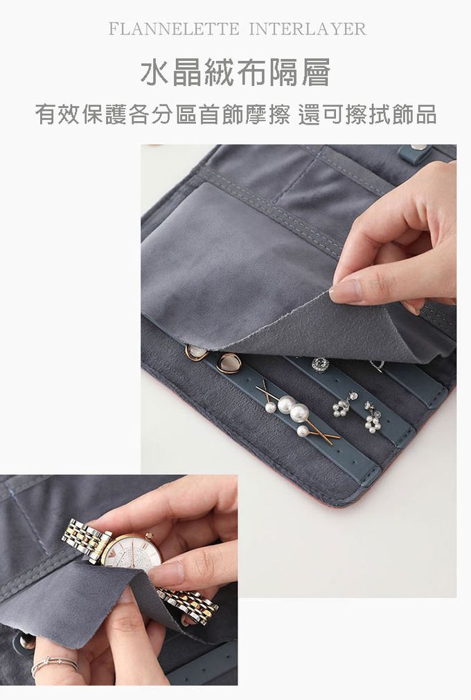 成分:精緻分類,首飾不丟失 嚴選柔軟防滑面料 柔軟舒適,更呵護首飾 可視拉鏈袋,方便物品尋找 鈕扣式項鏈掛圈,可放各種手鏈、手鐲 開放式耳釘/戒指收納倉 水晶絨布隔層,有效保護首飾也可當擦拭布 扁平設計,節省空間