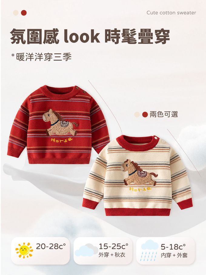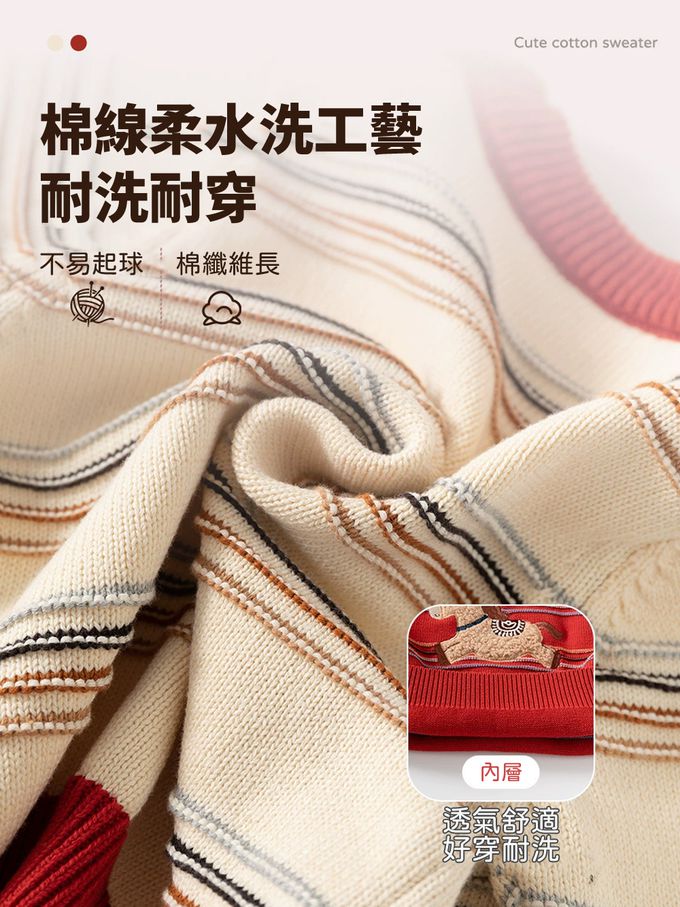 純棉圓領針織長袖上衣-快樂馬兒-紅色條紋