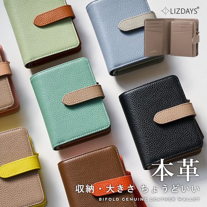 日本 LIZDAYS - 14口袋高收納力真皮對折式中夾-卡其x黃 (12x9.5cm)