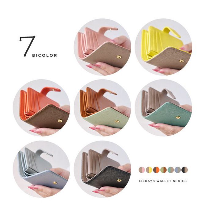 日本 LIZDAYS - 14口袋高收納力真皮對折式中夾-果綠x咖 (12x9.5cm)