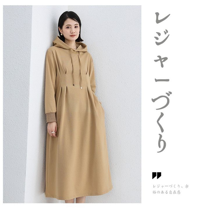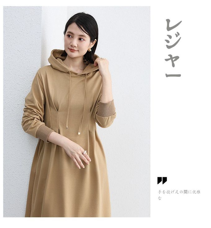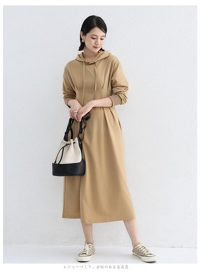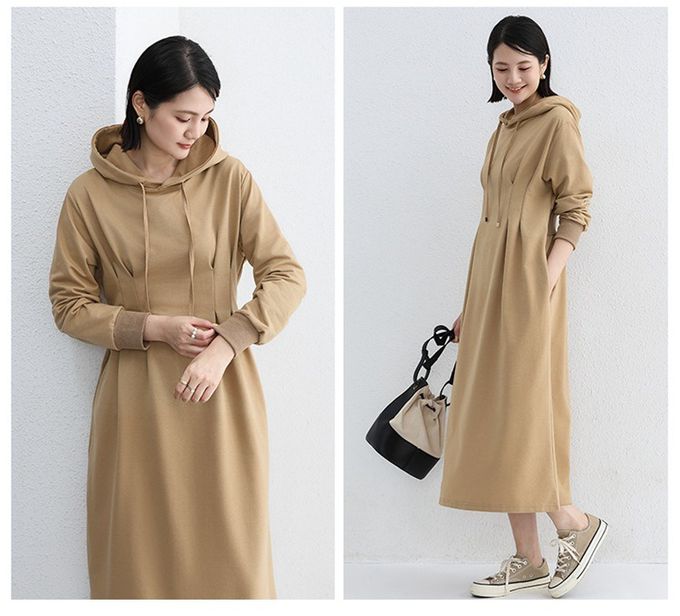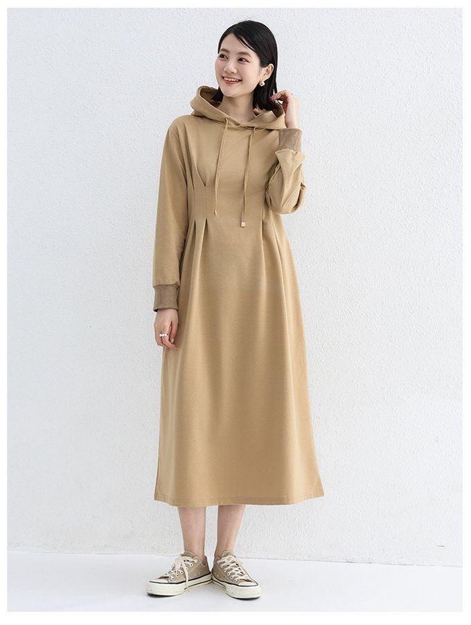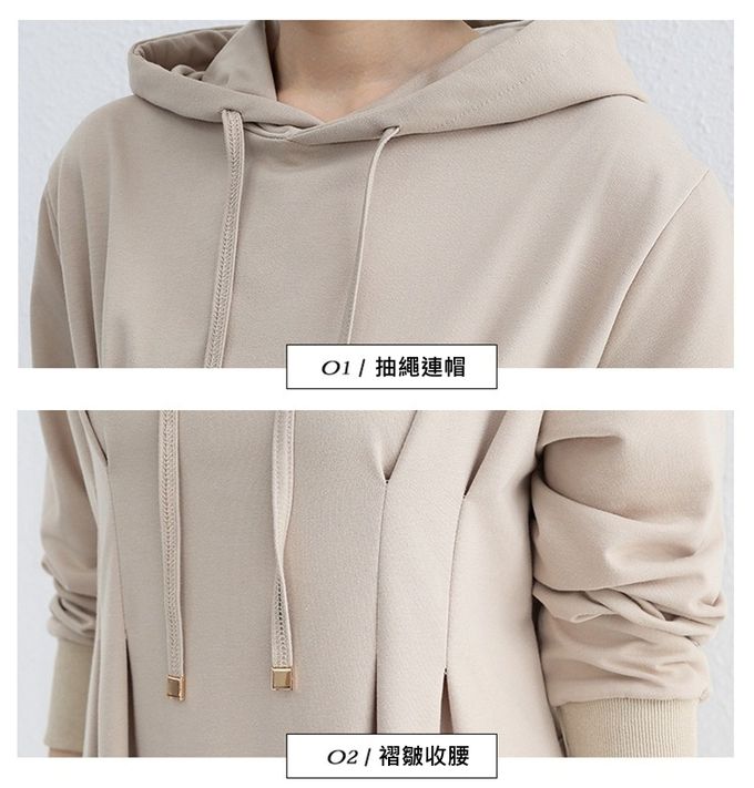 • 品名:休閒感抓褶修身剪裁長袖連帽洋裝