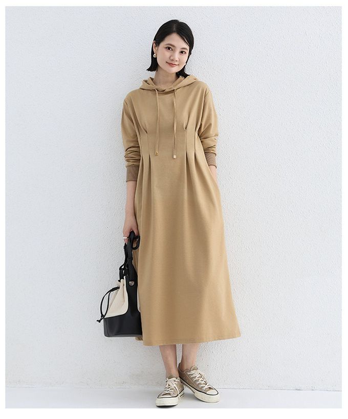 Yukié - 休閒感抓褶修身剪裁長袖連帽洋裝-卡其