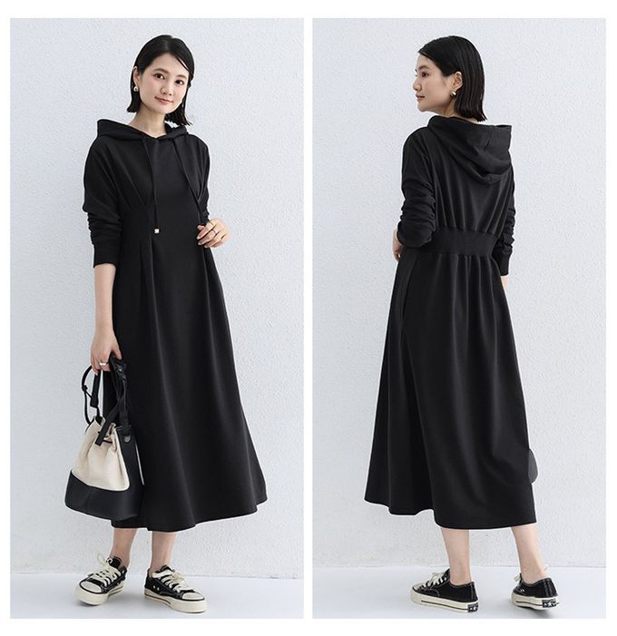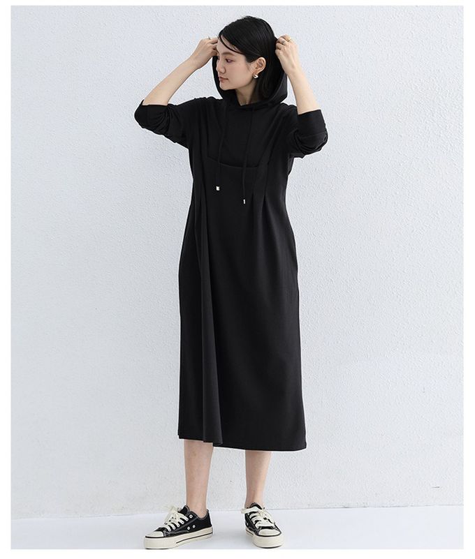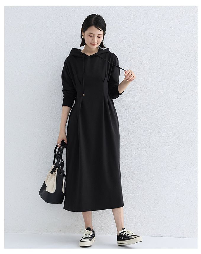 Yukié - 休閒感抓褶修身剪裁長袖連帽洋裝-黑