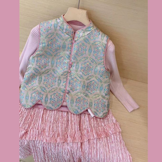 • 品名:新中式旗袍領盤扣織錦背心絲絨壓摺長裙套裝