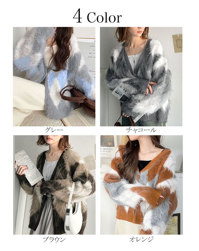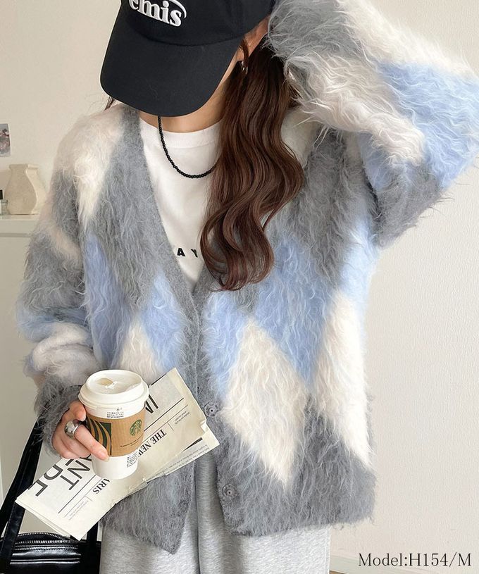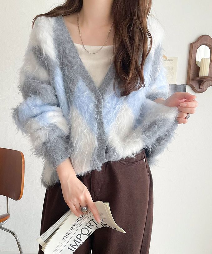 日本 Classical Elf - 浪漫毛海菱格針織開襟衫-藍x灰