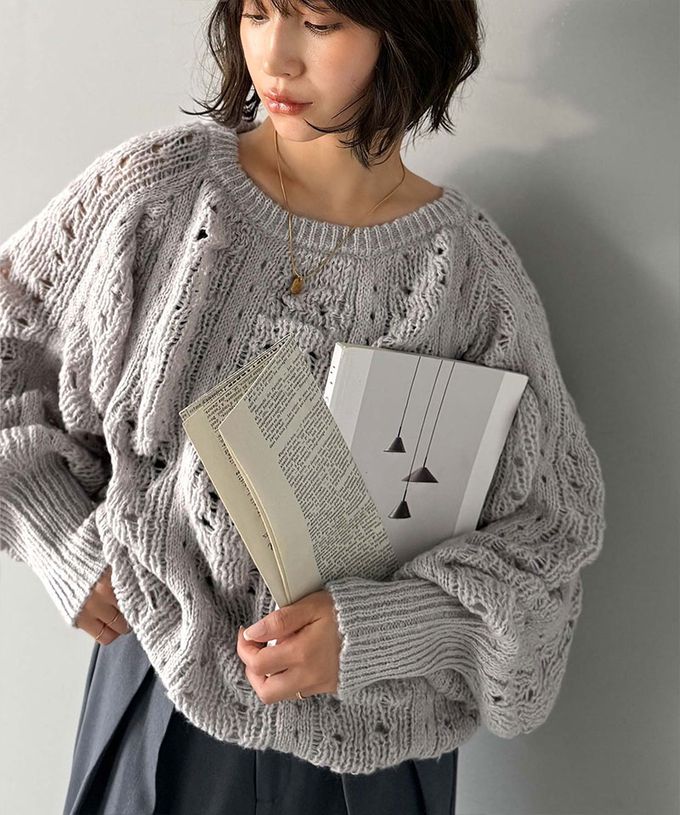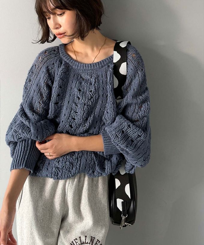 日本 Classical Elf - 蓬鬆鏤空寬袖針織上衣-深灰藍