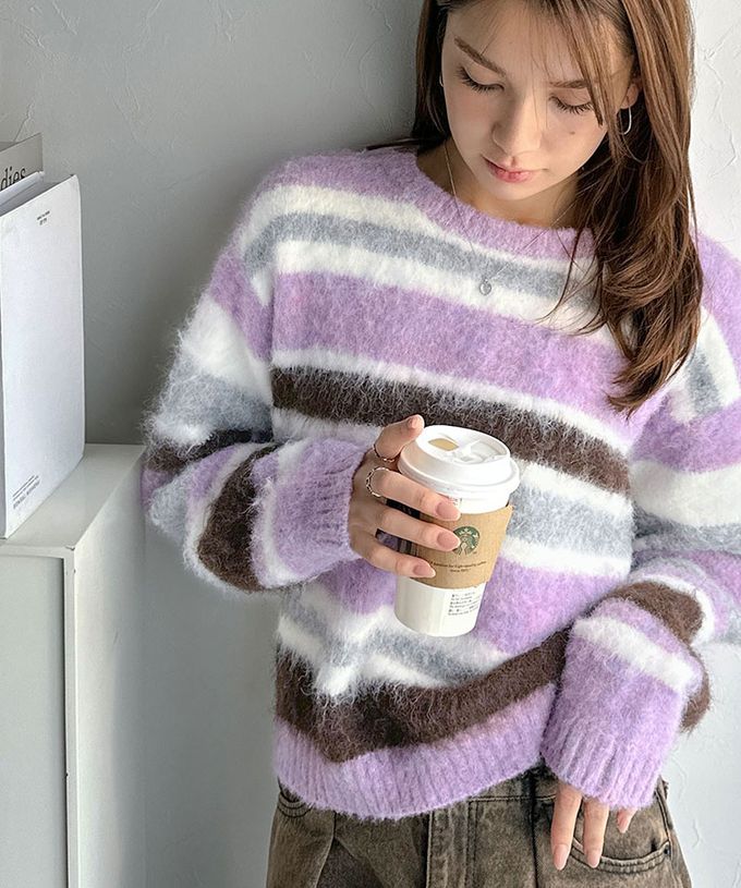 日本 Classical Elf - 絢麗混色條紋毛海針織上衣-紫系