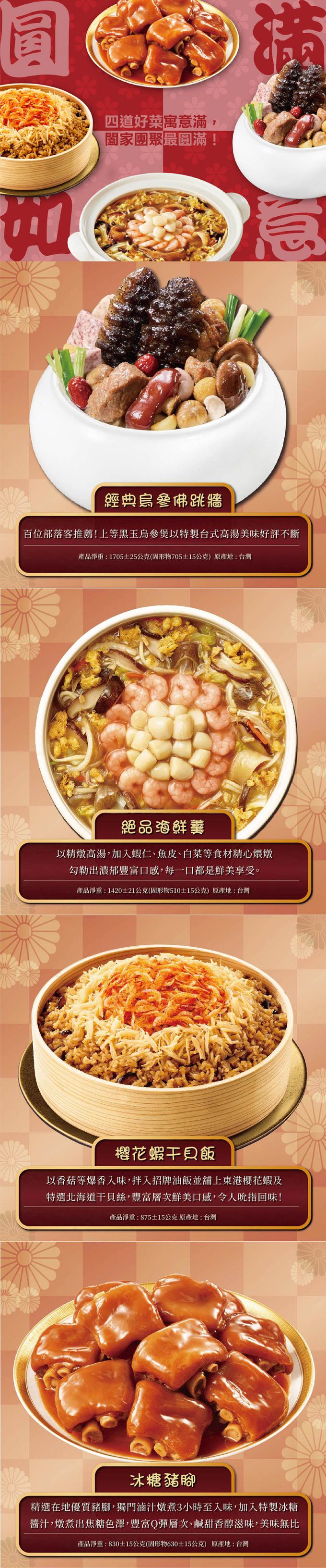 圓滿如意J-(烏參佛跳牆+冰糖豬腳+絕品海鮮羹+櫻花蝦干貝飯)