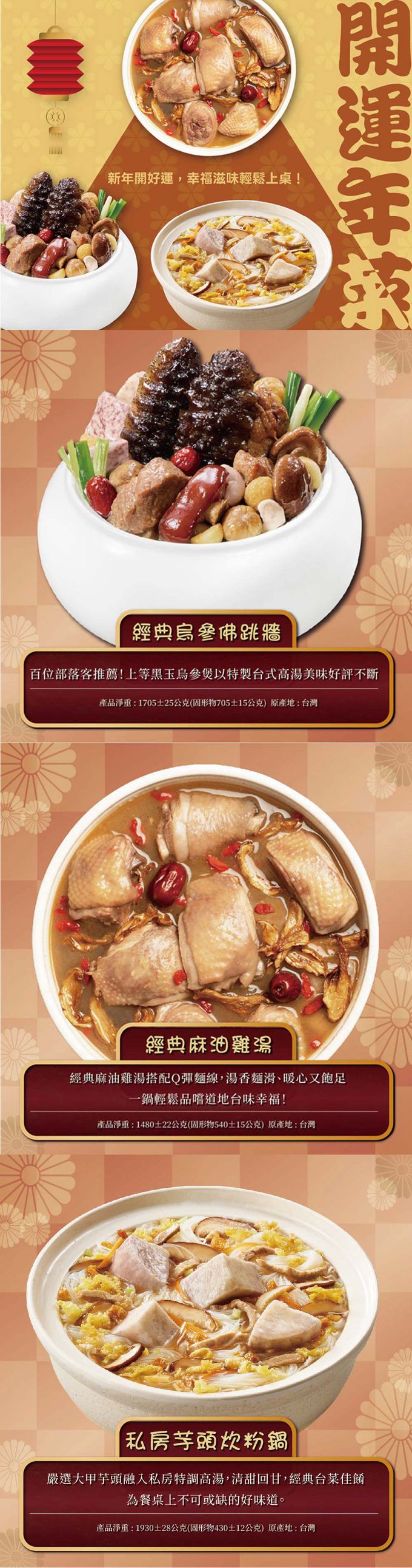 開運年菜E-(烏參佛跳牆+經典麻油雞湯+私房芋頭炊粉鍋)