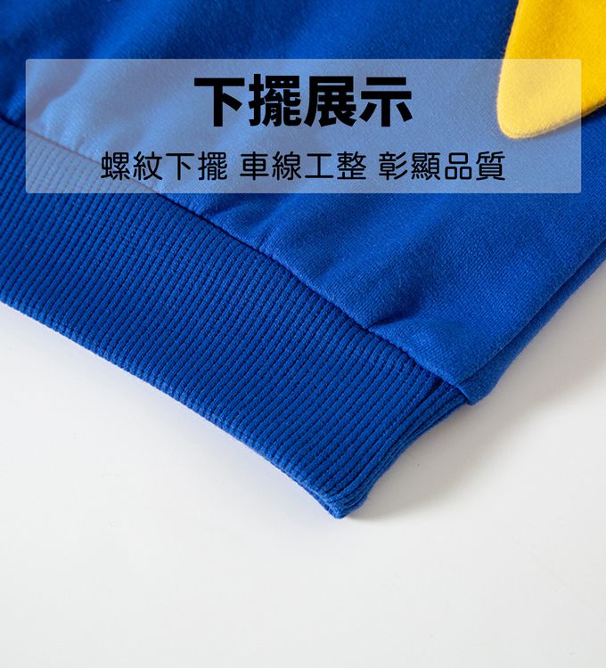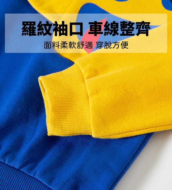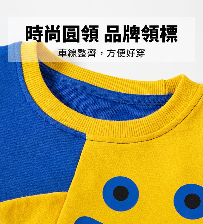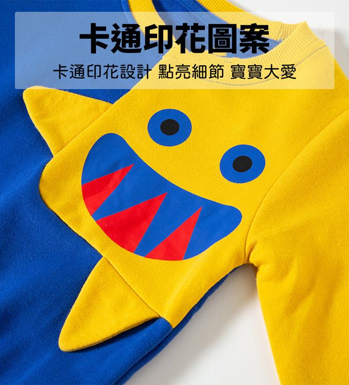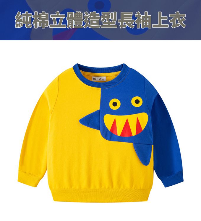 純棉立體造型長袖上衣/大學T-Q版鯊魚-拼色黃