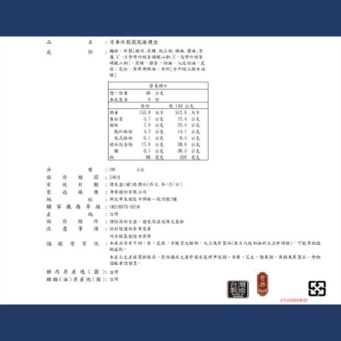 備註欄:本產品含有牛奶及其製品、蛋及其製品、堅果種子類及其製品、含有麩質的穀類及其製品、大豆及其製品,可能導致過敏症狀。