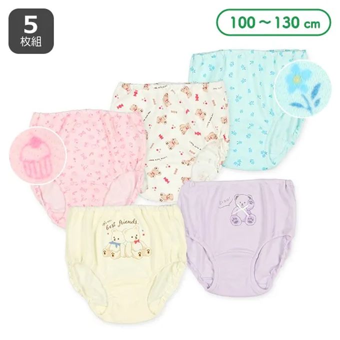 日本西松屋 - 混棉女孩印花內褲(5件組)-小熊&小花-粉紫藍黃