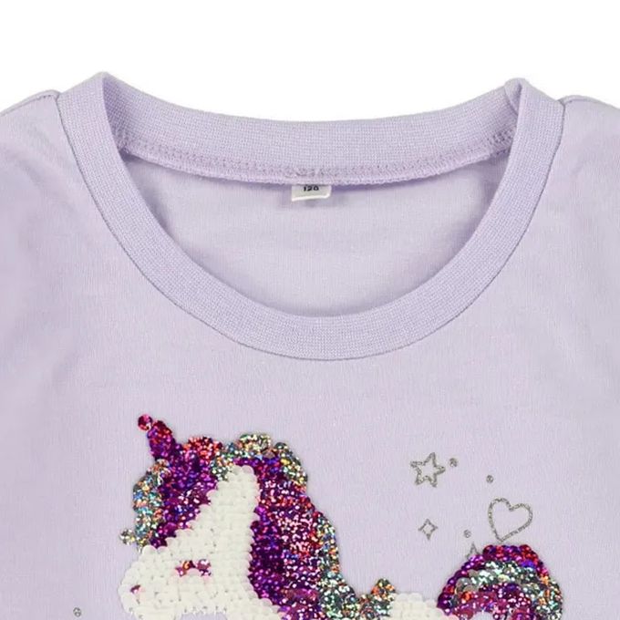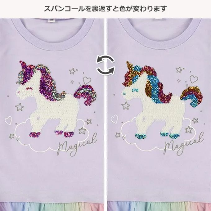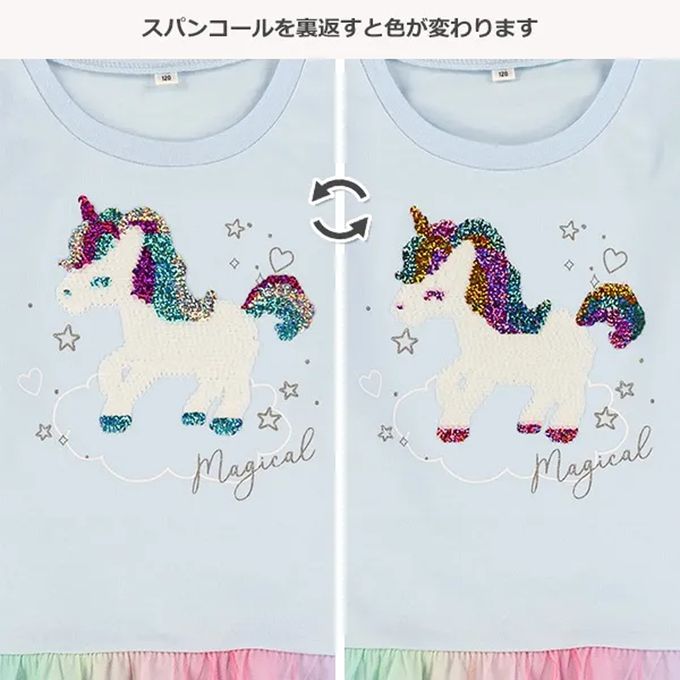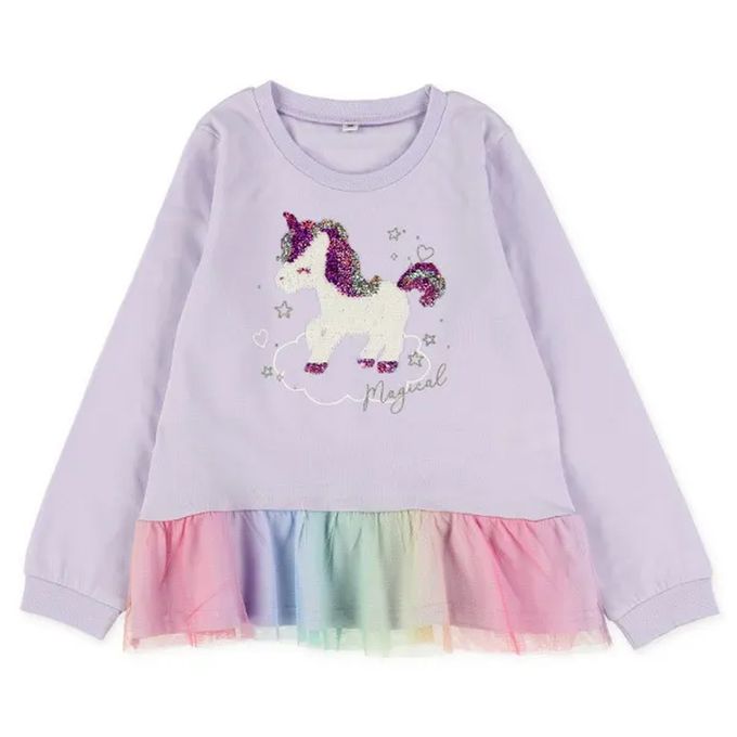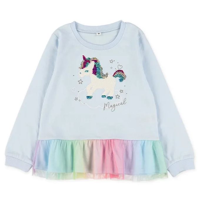 • 品名:亮片獨角獸繽紛薄紗下擺長袖上衣