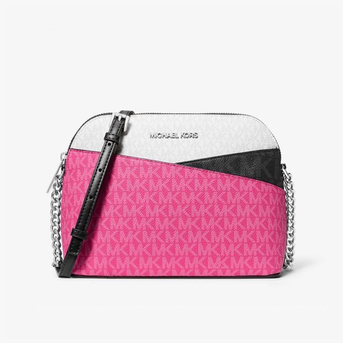 三色拼接鍊條貝殼包 (桃白灰)