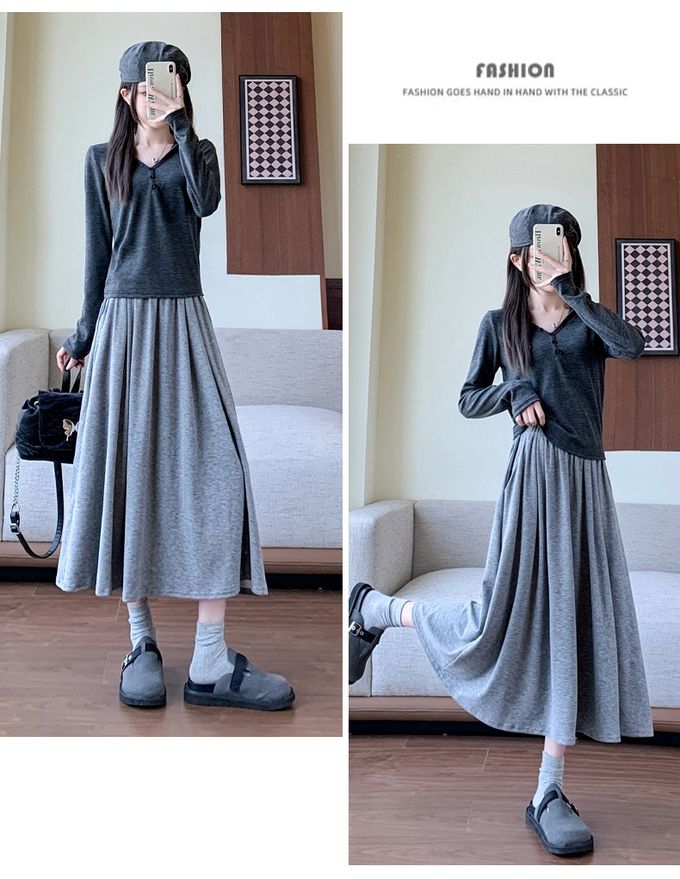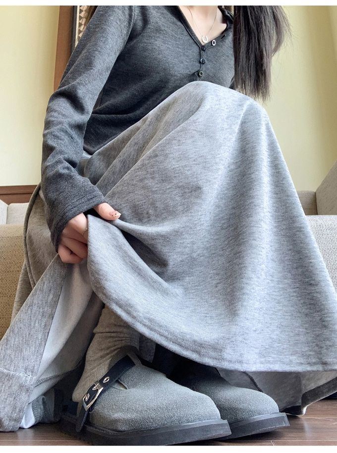 Lusairé - 舒適鬆緊腰顯瘦抗皺A字中長裙-淺灰
