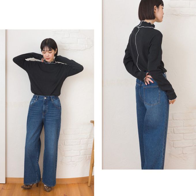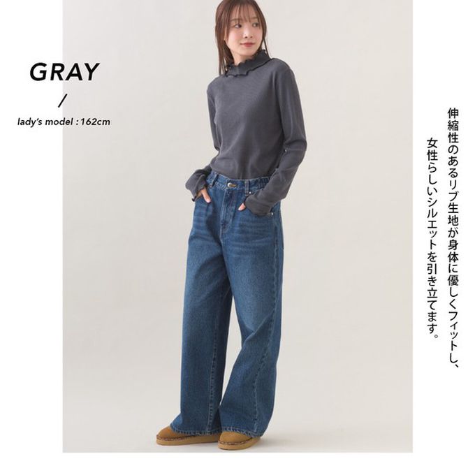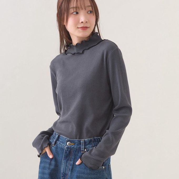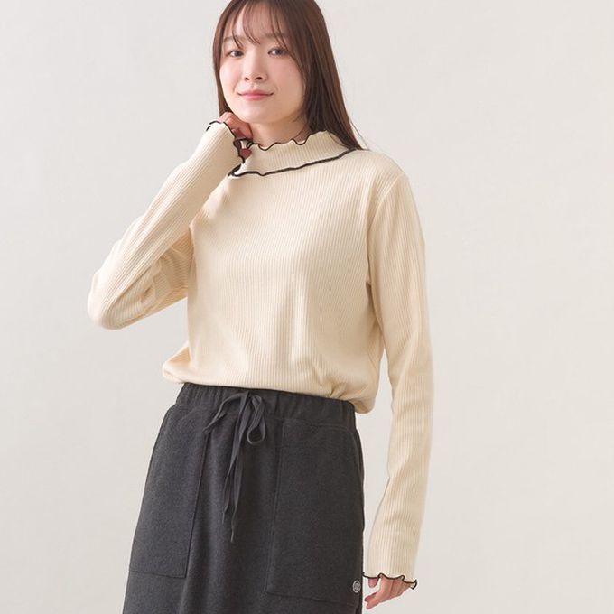 日本 OMNES - 柔美木耳滾邊顯瘦高領長袖上衣-黑