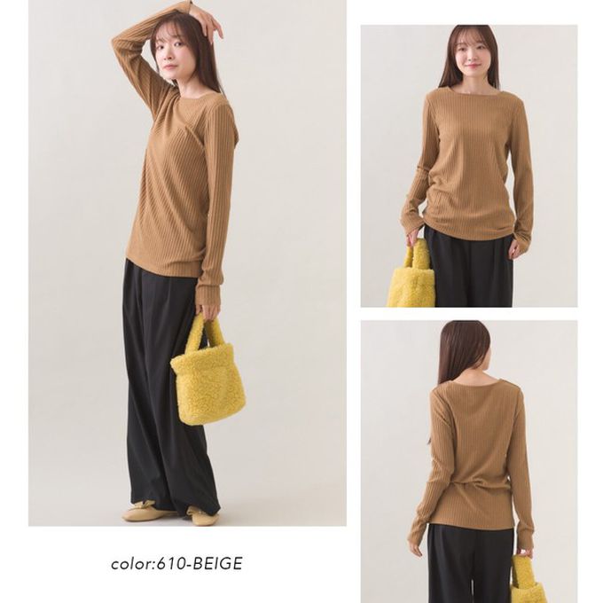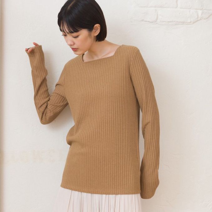 日本 OMNES - 迷人方領混嫘縈羅紋長袖上衣-卡其棕