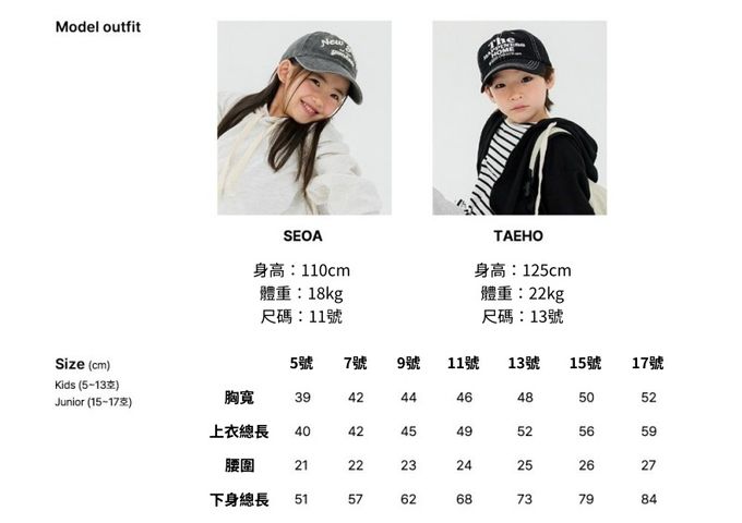 1. 尺寸表單位皆為公分(cm),實際尺寸會因布料彈性、水洗、測量起迄點等因素略有誤差。建議參考孩子平時穿著衣物尺寸進行選購。