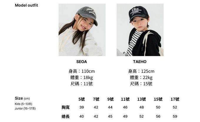 1. 尺寸表單位皆為公分(cm),實際尺寸會因布料彈性、水洗、測量起迄點等因素略有誤差。建議參考孩子平時穿著衣物尺寸進行選購。