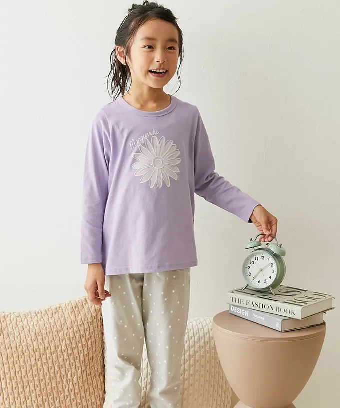 日本 devirock - 100%棉 高腰長袖家居服套裝-花朵點點-紫丁香x淺灰