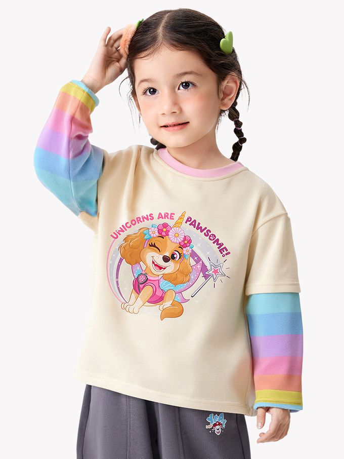 卡通汪汪隊假兩件長袖上衣-卡通人物天天-米杏+彩虹條紋