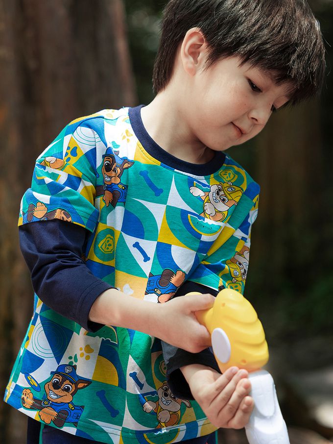 卡通汪汪隊純棉假兩件長袖上衣-卡通人物阿奇/小礫-綠色印花