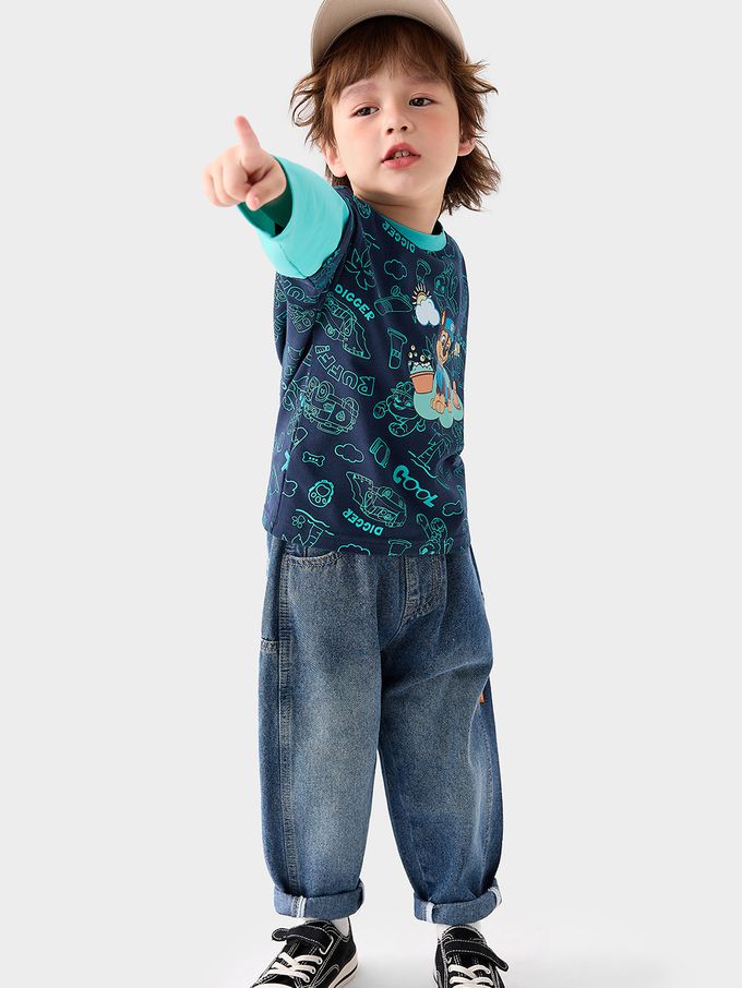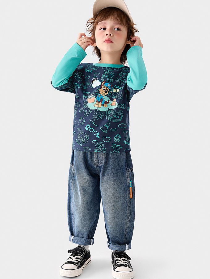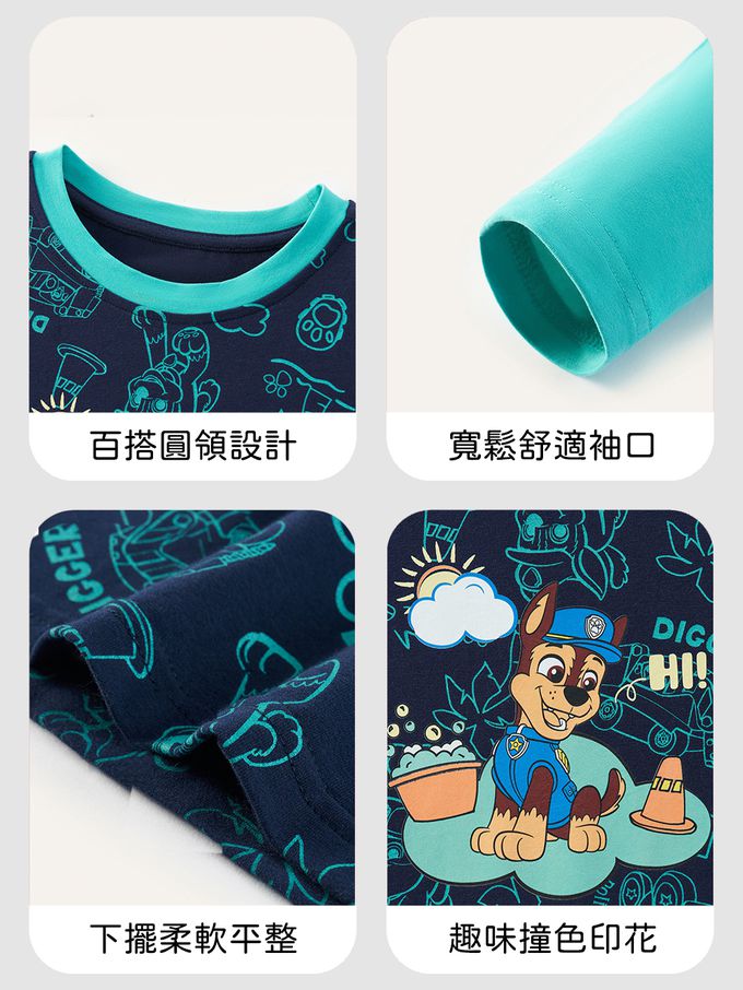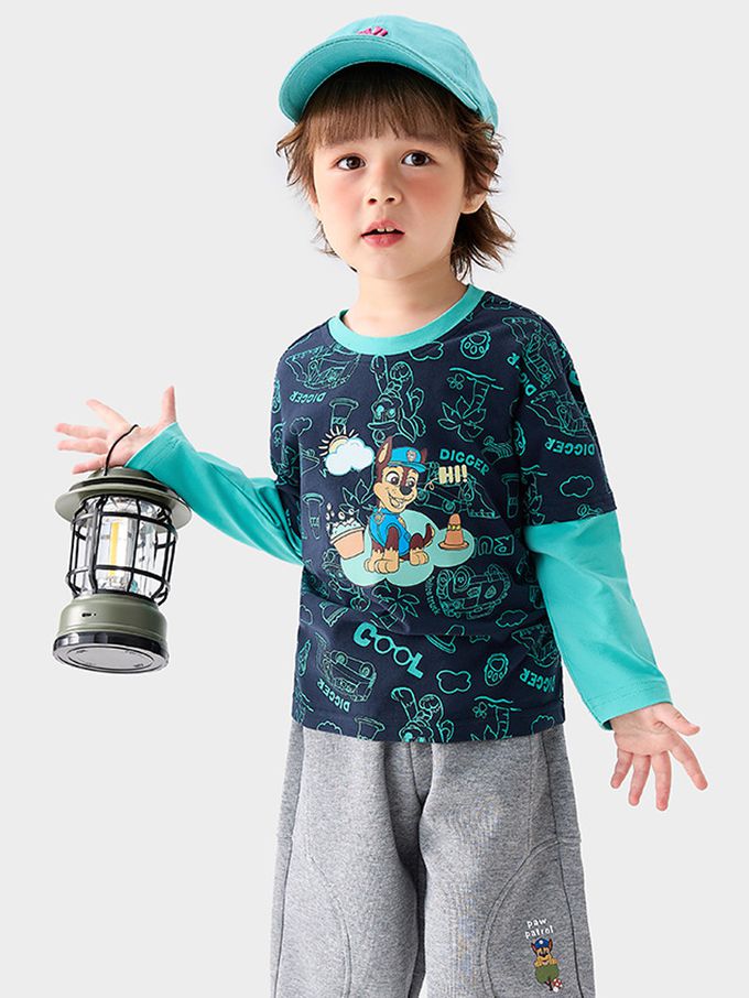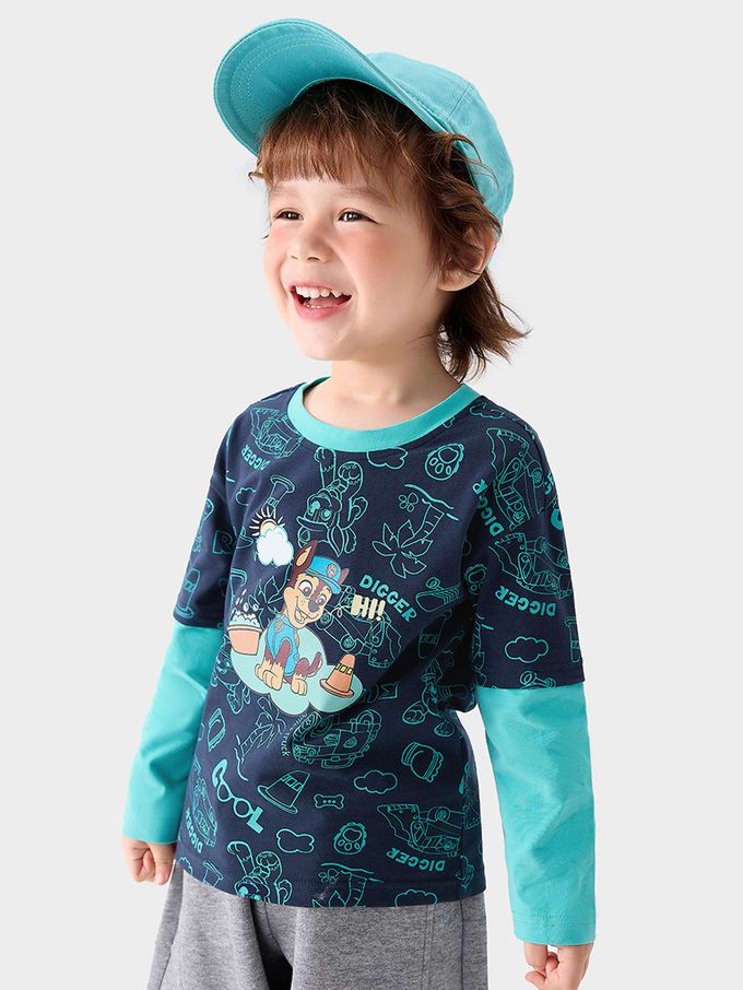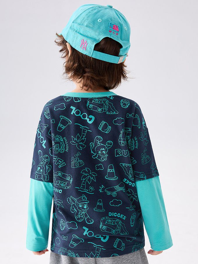 卡通汪汪隊假兩件長袖上衣-卡通人物阿奇-藏青/藍綠