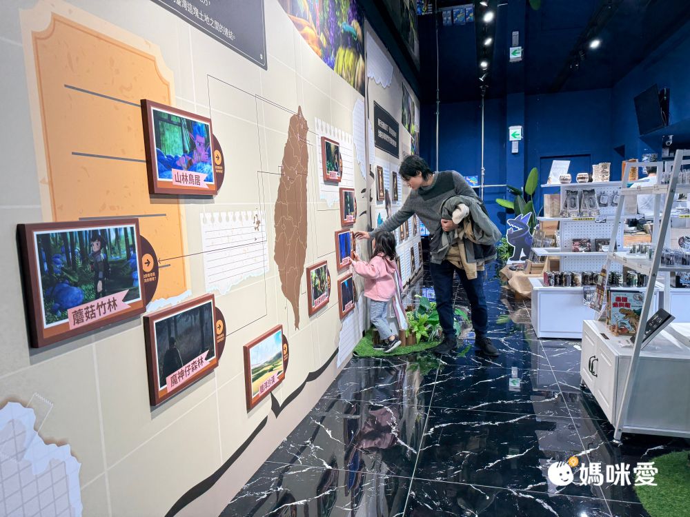 影片結束後離場會經過紀念品店,裡面除了販售周邊,還有一整面牆的互動裝置,可以讓大家更了解故事角色和背景設定。