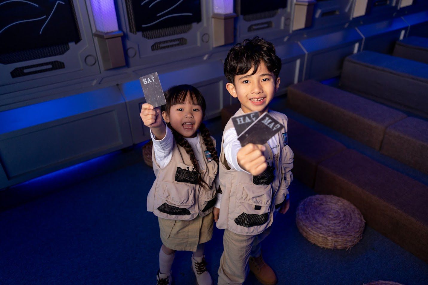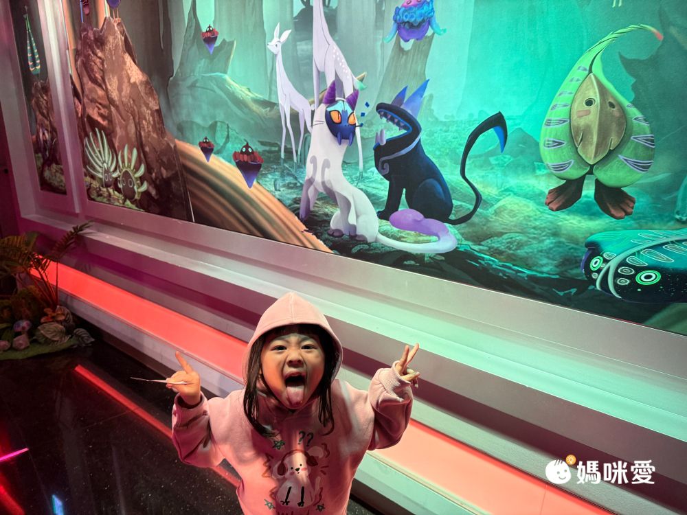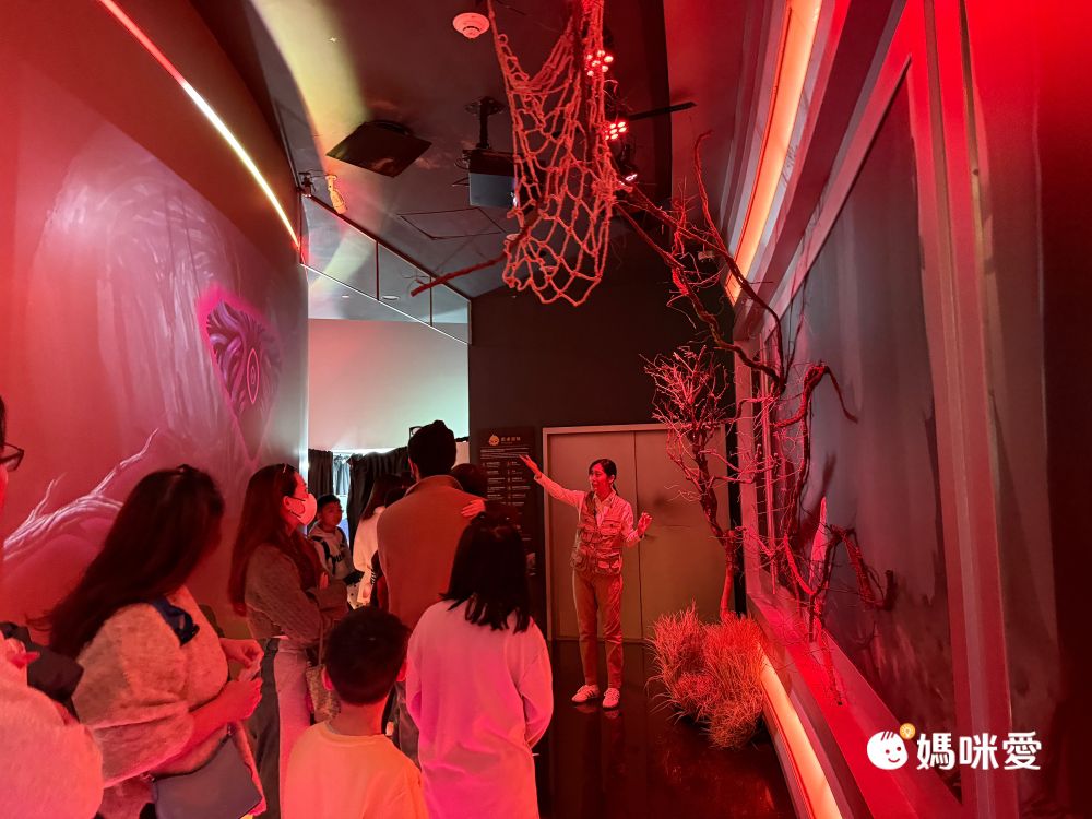 接著跟著工作人員進到一個小劇場,聽冒險家夫妻到底發生了什麼事、我們為什麼要來幫忙他們。這一段不只是坐著聽講或看影片,還會讓小朋友拿著手電筒在空間裡找線索,再搭配劇情一路往下一關前進,整個過程是慢慢鋪陳的。