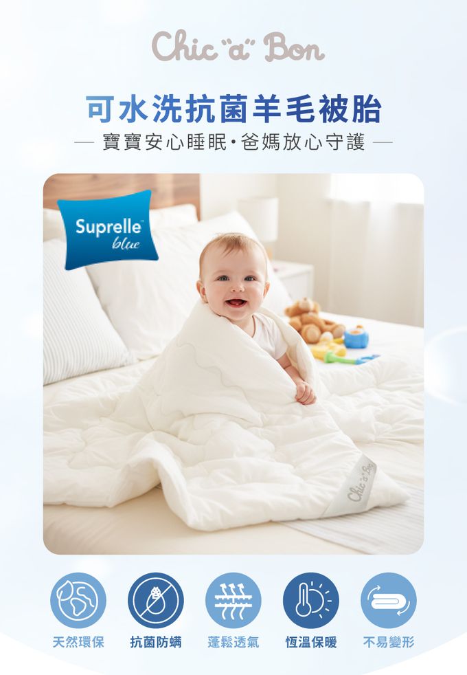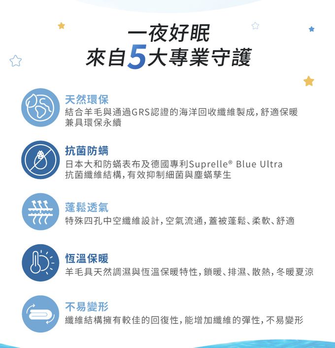 2.抗菌防螨:日本大和防蟎表布,與通過法國 IFTH 與美國 NAMSA 抗菌實證 — 德國專利Suprelle® Blue Ultra抗菌纖維結構,有效抑制細菌與塵蟎孳生