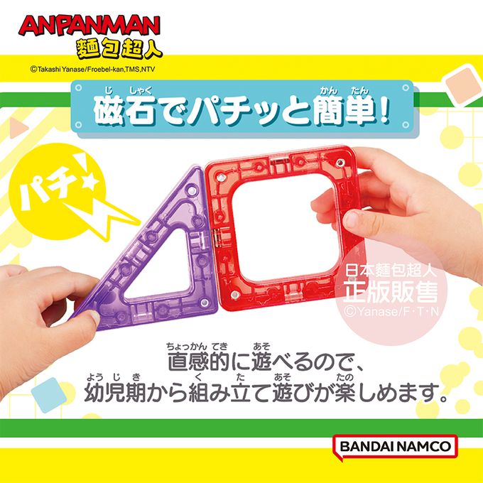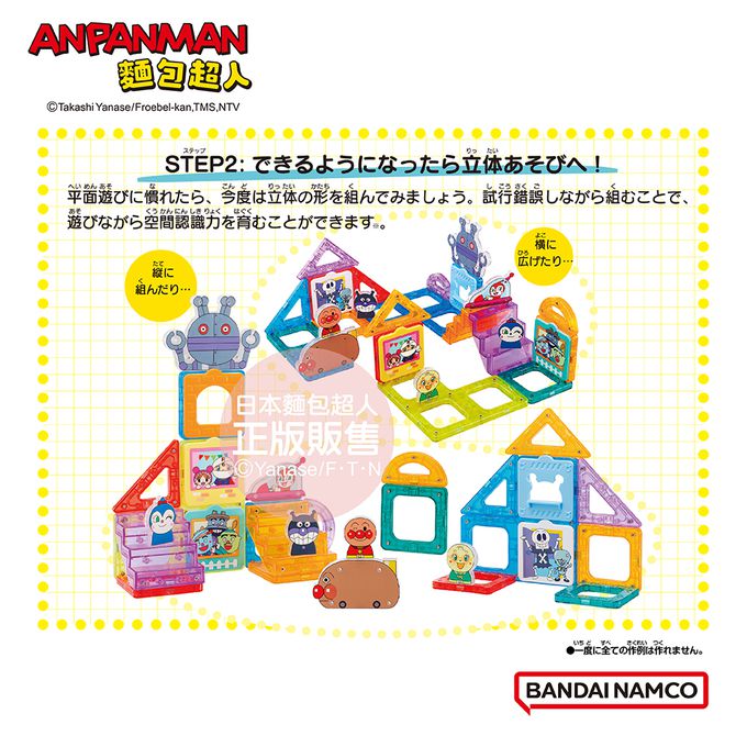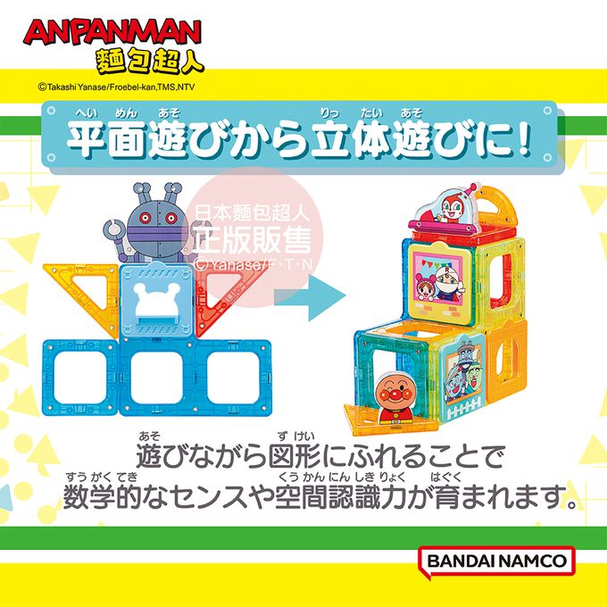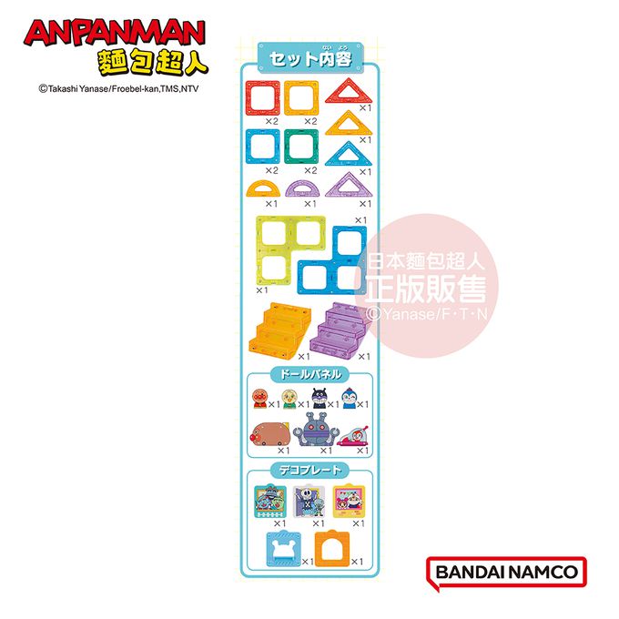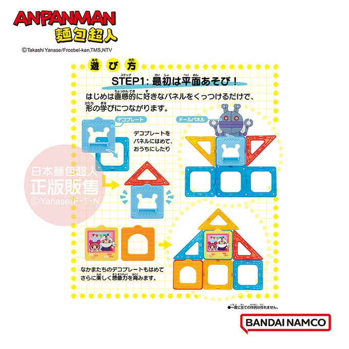 在玩耍過程中,學習「想像力」、「空間認識」、「顏色」及「形狀」,從平面到立體組合遊戲,到扮家家酒遊戲等,搭配麵包超人圖案的積木或麵包超人伙伴們的裝飾配件一起玩耍,趣味玩法更多元,刺激腦部發展,激發想像力,體驗各種不同玩法樂趣!