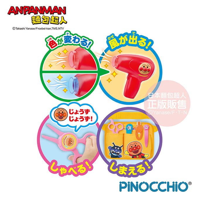 內含豐富音效及5種麵包超人日語對話,豐富有趣!與麵包超人一起體驗理髮店的樂趣吧!
