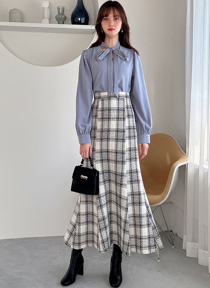 日本 GRL - 經典粗花呢格紋優雅魚尾裙-白系