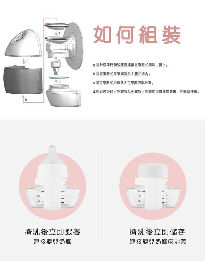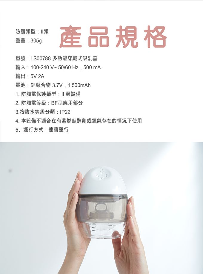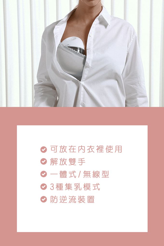 ▲時尚美觀水滴造型更貼合胸型▲無線型媽咪輕盈集乳,解放雙手▲TypeC充電可使用1.5小時,頂級防觸電處理▲三種按摩/吸乳模式,五段吸力調整▲全新設計儲存瓶,輕鬆轉換餵奶瓶▲易拆裝,好清洗