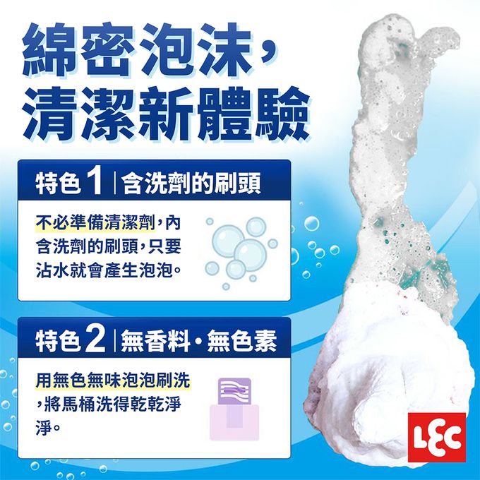 不必額外準備清潔劑,內含洗劑的刷頭,只要沾水就會產生泡泡,將馬桶洗得乾乾淨淨。