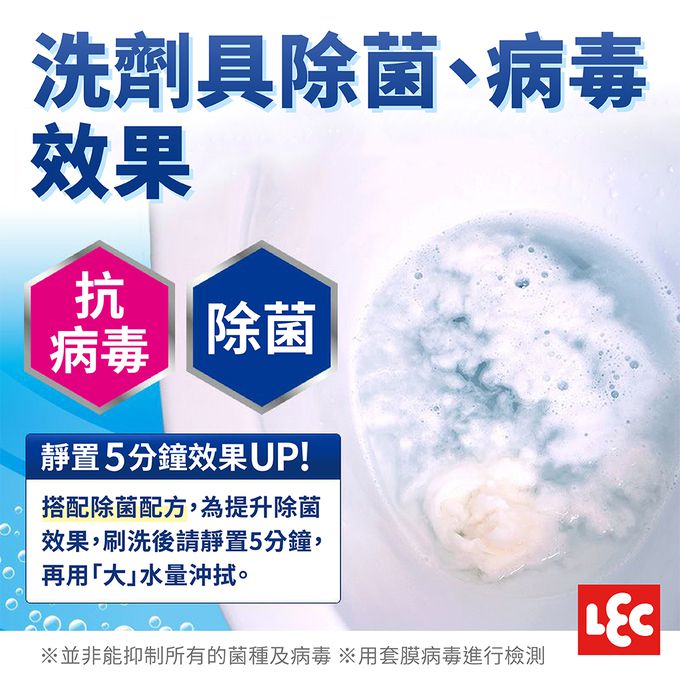 搭配除菌配方,清潔馬桶的同時,也能有效除菌、病毒。為提升除菌效果,刷洗後請靜置5分鐘,再用「大」水量沖拭。