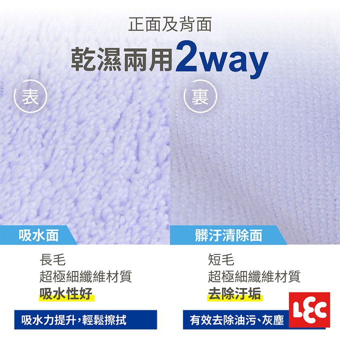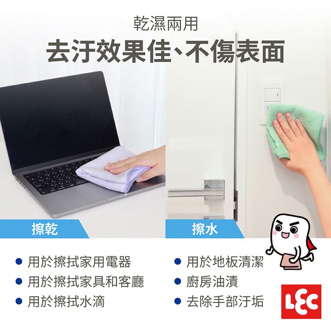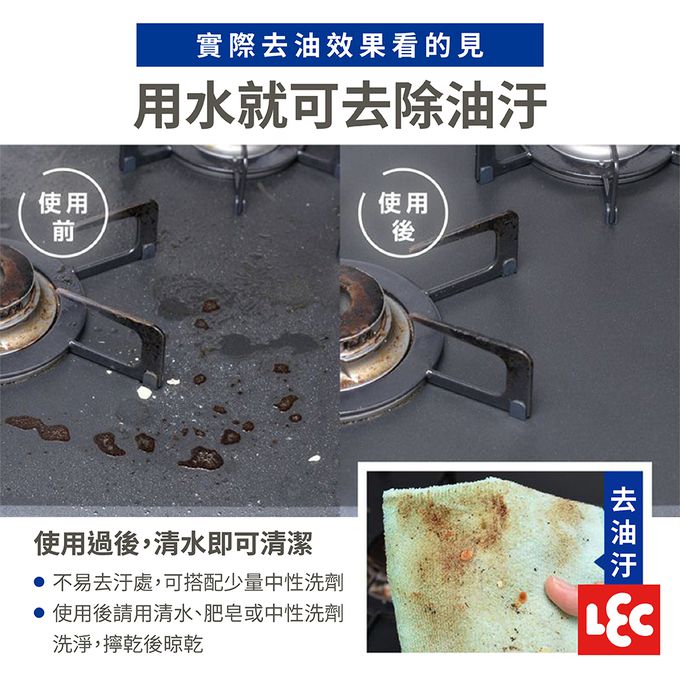 採用超極細纖維材質,不用洗劑也能去污!乾濕兩用,吸水及吸油性佳,有效去除油污、灰塵、水滴等髒污。