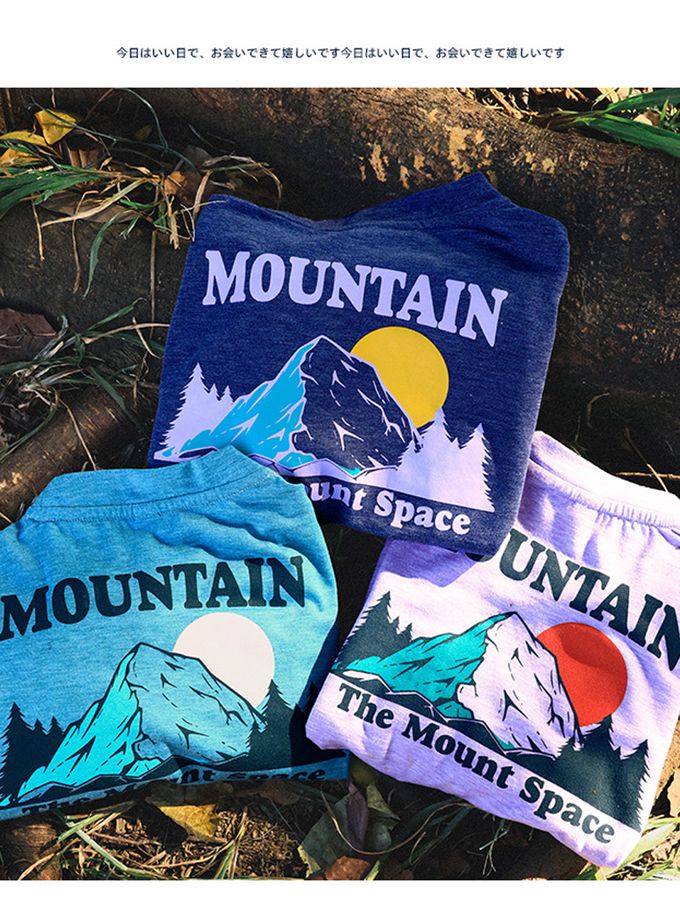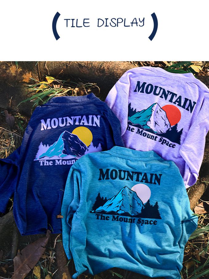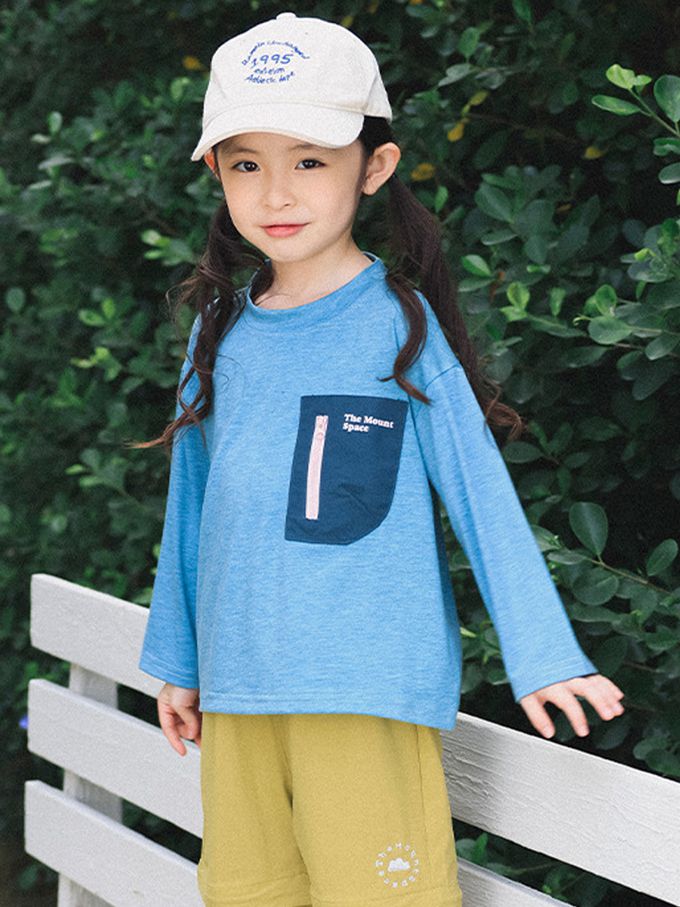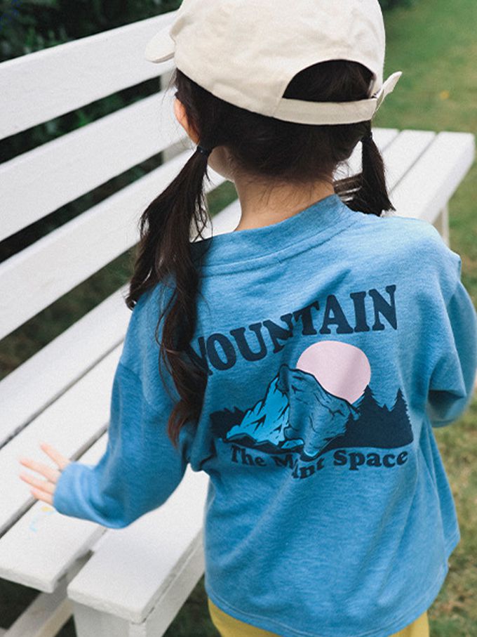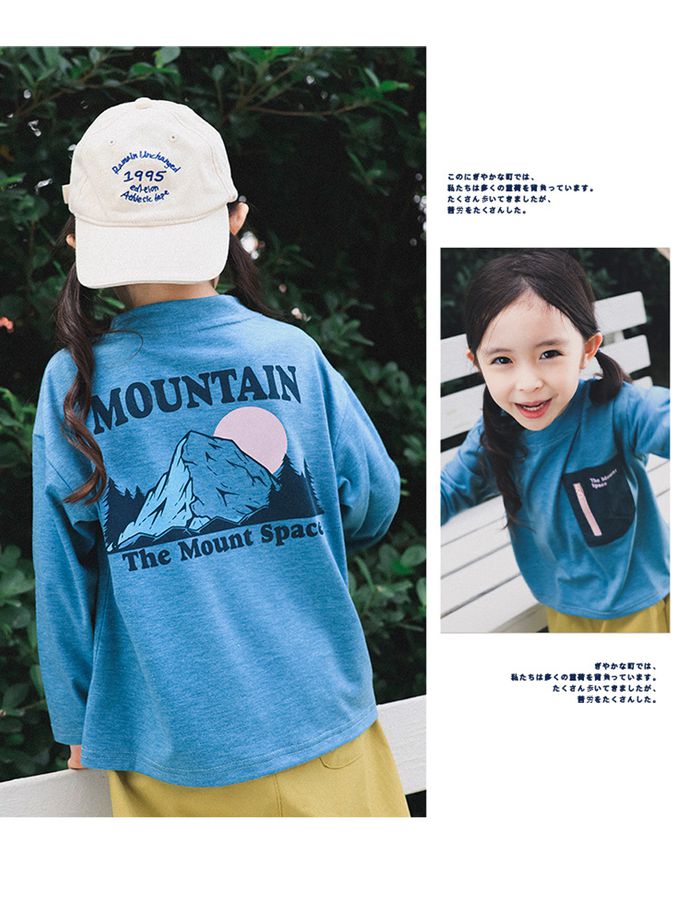 撞色口袋長袖上衣-復古大山插畫-藍色
