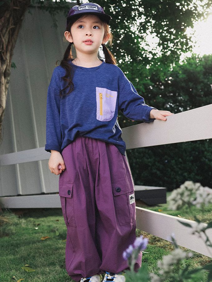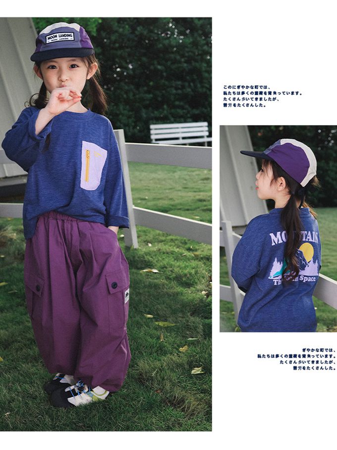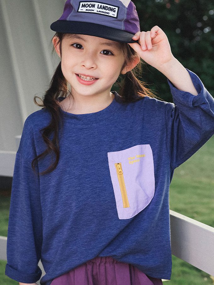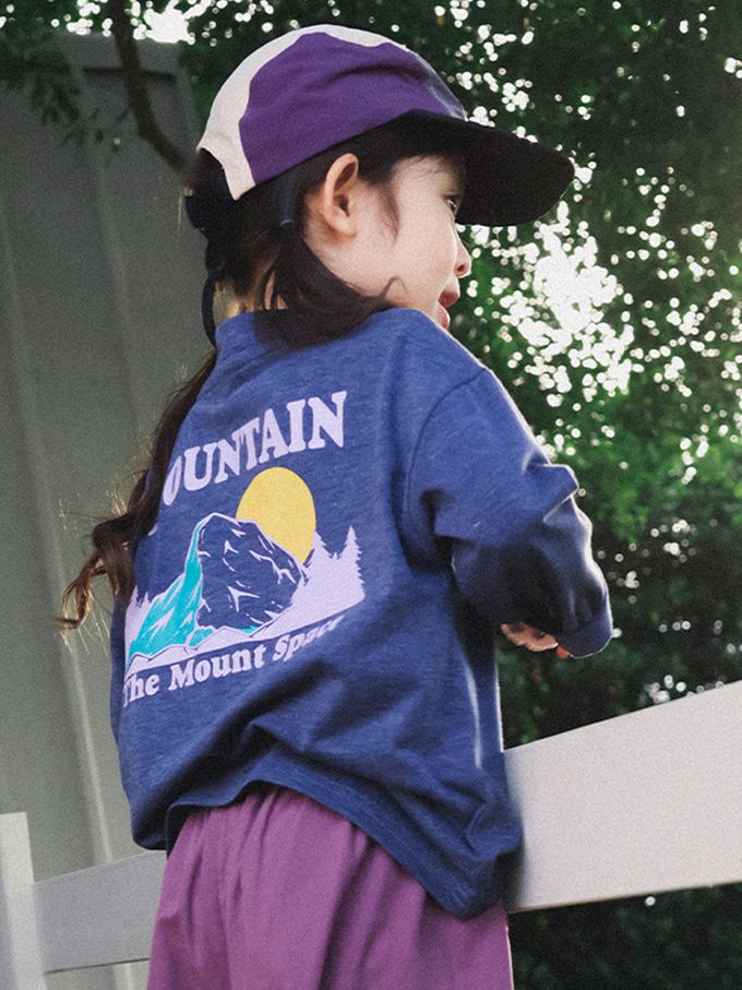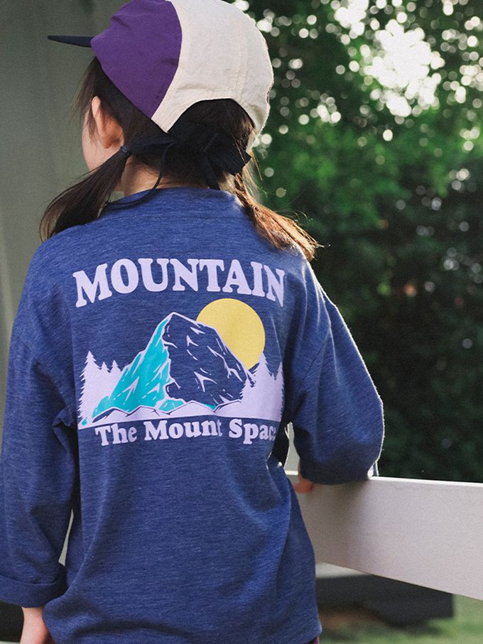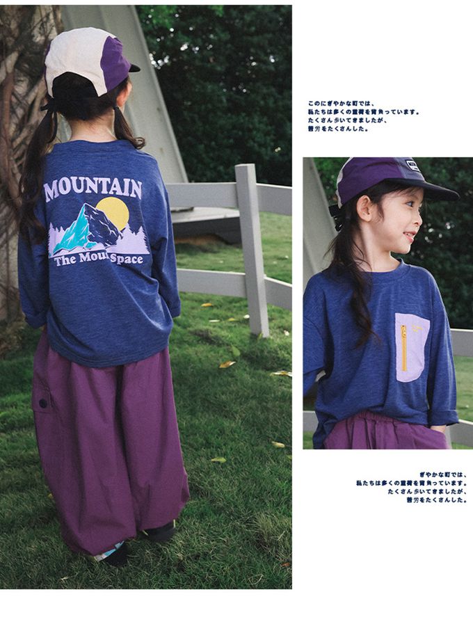 Y B S - 撞色口袋長袖上衣-復古大山插畫-藏青
